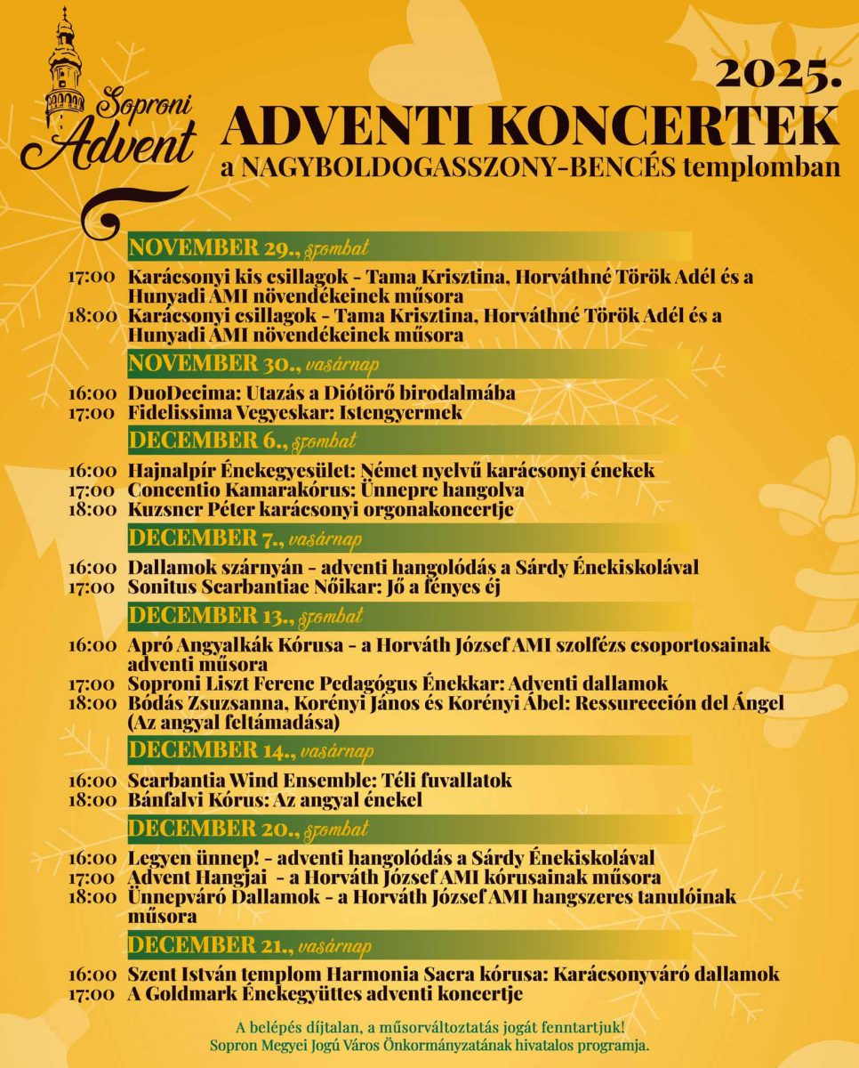 Idén is a Fidelissima Vegyeskar közreműködésével gyújtják meg Sopronban a város első adventi gyertyáját november 30-án, vasárnap 18 órakor a Fő téren található Szentháromság-szobornál.